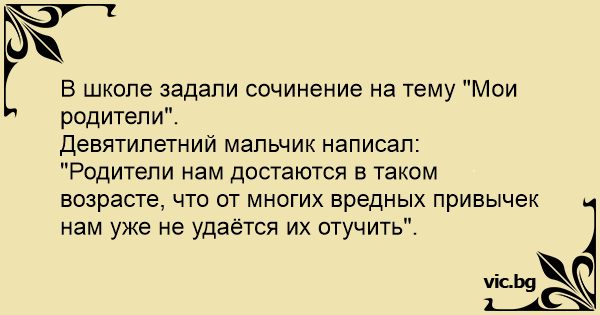 Девятилетний мальчик написал: "Родители нам достаются в таком возрасте, что от многих вредных привычек нам уже не удаётся их отучить".