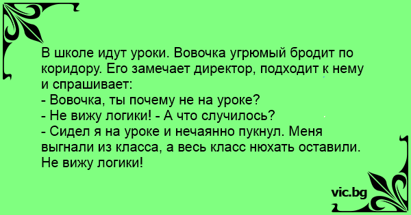 Вовочка идет по коридору школы и говорит: - Не вижу логики, нет я совершенно не вижу логики. Как это, нет логики тут нет. На встречу директор: - Вовочка что случилось. Вовочка: - Я нап%рдел в классе, меня выгнали, они остались нюхать, не вижу логики.