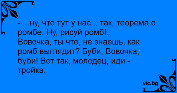 Вовочка, ты что, не знаешь, как ромб выглядит? Буби, Вовочка, буби! Вот так, молодец, иди - тройка.