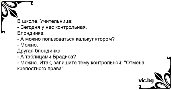 Днес ще имаме контролно. В училище. Учителката: - Сегодня у нас контрольная. - А можно пользоваться калькулятором? - Можно. - А таблицами Брадиса? - Можно. Итак, дети, запишите тему контрольной. Отмена крепостного права.