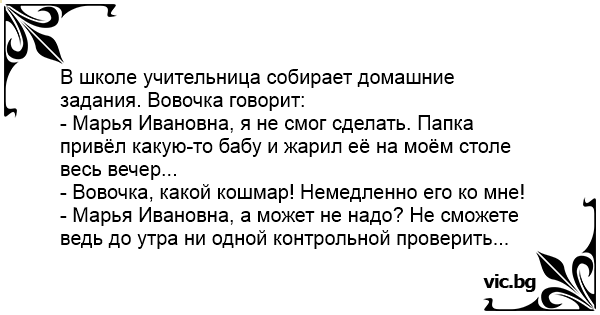 В школе учительница собирает домашние задания. Вовочка говорит: