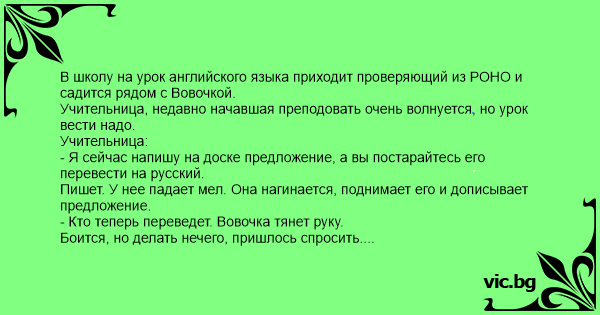 Урок английского. На задней парте устроился мужик - проверяющий из РОНО. Молодая учительница пишет на доске английскую фразу и просит учеников перевести. Класс молчит, и вдруг с предпоследней парты руку тянет Вовочка.