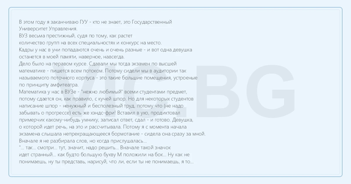 В этом году я заканчиваю ГУУ - кто не знает, это Государственный Университет Управления. ВУЗ весьма престижный, судя по тому, как растет количество групп на всех специальностях и конкурс на место. Кадры у нас в уни попадаются очень и очень разные - и вот одна девушка останется в моей памяти, наверное, навсегда. Дело было на перавом курсе. Сдавали мы тогда экзамен по высшей математике - пишется всем потоком. Потому сидели мы в аудитории так называемого поточного корпуса - это такие большие помещения, устроеные по принципу амфитеатра. Математика у нас в ВУЗе - "нежно любимый" всеми студентами предмет, потому сдается он, как правило, с кучей шпор. Но для некоторых студентов написание шпор - ненужный и бесполезный труд, потому что (не надо забывать о прогрессе) есть же хэндс-фри! Вставил в ухо, продиктовал примерчик какому-нибудь умнику, записал ответ, сдал - и готово. Девушка, о которой идет речь, на это и рассчитывала. Потому я с момента начала экзамена слышала непрекращающееся бормотание - сидела она сразу за мной. Вначале я не разбирала слов, но когда прислушалась... "... так... смотри... тут, значит, надо решить... Вначале такой значок идет странный... как будто большую букву М положили на бок... Ну как не понимаешь, ну ты представь, нарисуй, что ли, если ты не понимаешь, я то как должна... Вот, и над ней сверху лежит восьмерка..." Не знаю, как собеседник милой девушки, но я далеко не сразу поняла, что надо посчитать сумму от Х до бесконечности... В этом году она станет дипломированным специалистом...))