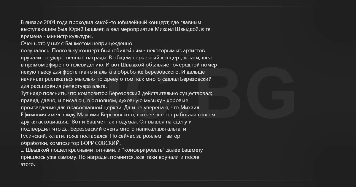 В январе 2004 года проходил какой-то юбилейный концерт, где главным выступающим был Юрий Башмет, а вел мероприятие Михаил Швыдкой, в те времена - министр культуры. Очень это у них с Башметом непринужденно получалось. Поскольку концерт был юбилейным - некоторым из артистов вручали государственные награды. В общем, серьезный концерт; кстати, шел в прямом эфире по телевидению. И вот Швыдкой объявляет очередной номер - некую пьесу для фортепиано и альта в обработке Березовского. И дальше начинает растекаться мыслью по древу о том, как много сделал Березовский для расширения репертуара альта. Тут надо пояснить, что композитор Березовский действительно существовал; правда, давно, и писал он, в основном, духовную музыку - хоровые произведения для православной церкви. Да и не уверена я, что Михаил Ефимович имел ввиду Максима Березовского; скорее всего, сработала совсем другая ассоциация... Вот и Башмет так подумал. Он вышел на сцену и подтвердил, что да, Березовский очень много написал для альта, и Гусинский, кстати, тоже постарался. Но сейчас за роялем - автор обработки, композитор БОРИСОВСКИЙ. ... Швыдкой пошел красными пятнами, и "конферировать" далее Башмету пришлось уже самому. Но награды, помнится, все-таки вручали и после этого.