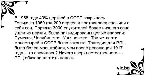 В 1958 году 40% церквей в СССР закрылось. Только за 1959 год 200 иереев и протоиереев сложили с себя сан. Порядка 3000 служителей более низшего сана ушли из церкви. Были ликвидированы целые епархии: Сумская, Челябинская, Ульяновская. Три четверти монастырей в СССР было закрыто. Трагедия для РПЦ была более масштабная, чем после революции 1917 года. Что случилось? Ничего сверхъестественного — РПЦ обязали платить налоги.