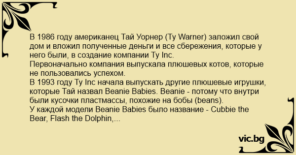 В 1993 году Ty Inc начала выпускать другие плюшевые игрушки, которые Тай назвал Beanie Babies. Beanie - потому что внутри были кусочки пластмассы, похожие на бобы (beans).