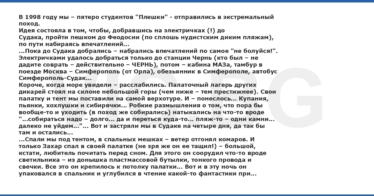 В 1998 году мы – пятеро студентов "Плешки" - отправились в экстремальный поход. Идея состояла в том, чтобы, добравшись на электричках (!) до Судака, пройти пешком до Феодосии (по сплошь нудистским диким пляжам), по пути набираясь впечатлений... ...Пока до Судака добрались – набрались впечатлений по самое "не болуйся!". Электричками удалось добраться только до станции Чернь (кто был – не дадите соврать – действительно – ЧЕРНЬ), потом – кабина МАЗа, тамбур в поезде Москва – Симферополь (от Орла), обезьянник в Симферополе, автобус Симферополь-Судак... Короче, когда море увидели – расслабились. Палаточный лагерь других дикарей стоял на склоне небольшой горы (чем ниже – тем престижнее). Свои палатку и тент мы поставили на самой верхотуре. И – понеслось... Купания, пьянки, хохлушки и сибирячки... Робкие размышления о том, что пора бы вообще-то и уходить (в поход же собирались) натыкались на что-то вроде "...собираться надо – долго... да и переться куда-то... пляж-то – одни камни... далеко не уйдем..."... Вот и застряли мы в Судаке на четыре дня, да так бы там и остались... ...Спали мы под тентом, в спальных мешках – ветер отгонял комаров. И только Захар спал в своей палатке (не зря же он ее тащил!) – большой, кстати, любитель почитать перед сном. Для этого он соорудил что-то вроде светильника – из донышка пластмассовой бутылки, тонкого провода и свечки. Все это он крепилось к потолку палатки... Вот и в эту ночь он упаковался в спальник и углубился в чтение какой-то фантастики при тусклом и мигающем свете свечки... Когда сон стал брать верх, Захар застегнулся в спальнике и уже почти выключился... однако про горящую свечу в последний момент все-таки вспомнил. Не желая высвобождаться из уютного спальника, он принял неожиданное решение – двумя ногами – в позе "березка" - долбануть по светильнику (много ли надо свечке, чтобы погаснуть?)... И долбанул... Свечка упала прямо ему на грудь и НЕ ПОГАСЛА. Мало того, вместе с нею упал и пластиковый "подсвечник"... Пара секунд у Захара ушла на то, чтобы стряхнуть остатки сна. За это время синтепон спальника и пластик "подсвечника" дружно занялись... Следующим действием Захара стала попытка ликвидировать источник возгорания путем сбрасывания его в позе "мостик" куда-нибудь вбок... Получилось частично – свечка действительно полетела вбок, а вот "подсвечник" и спальник похоже, решили погибать вместе – синтетические хреновины успели склеиться!!! Ужас состоял в том, что, упав, свечка снова НЕ ПОГАСЛА! А упала она на раскрытую книжку, прямо между страниц... Бумага полыхнула прямо у лица Захара. С этого момента наступила паника. Непонятно каким образом приняв вертикальное положение, Захар выпрыгнул из палатки, и, упав набок, покатился вниз по склону, стремясь сбить пламя. Вопил он при этом как сирена пожарной тревоги. Мы, естественно, проснулись. И вот, четырем парам глаз из-под навеса предстала такая картина: сияющая изнутри палатка (в черной крымской ночи – восхитительное зрелище!) и удаляющийся орущий огонек. Огонек то появлялся (когда Захар был брюхом кверху), то исчезал... и каждый раз, когда он появлялся и исчезал, на земле оставался другой огонек – эти огоньки пунктиром тянулись от палатки вниз по склону... Почему? Дело в том, что катился Захар по траве... По высокой траве... По высокой, выжженной крымским солнцем августовской траве... С пылающей синтет