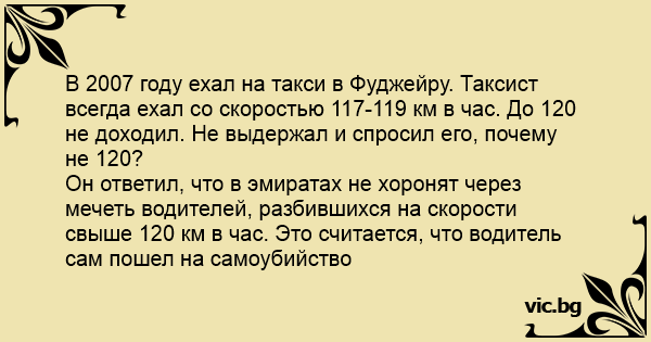 В 2007 году ехал на такси в Фуджейру. Таксист всегда ехал со скоростью 117-119 км в час. До 120 не доходил. Не выдержал и спросил его, почему не 120?