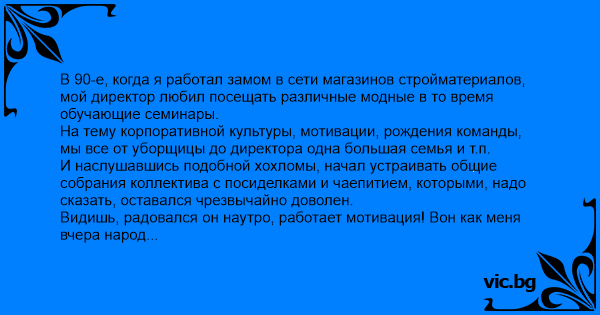 В 90-е, когда я работал замом в сети магазинов стройматериалов, мой директор любил посещать различные модные в то время обучающие семинары. На тему корпоративной культуры, мотивации, рождения команды, мы все от уборщицы до директора одна большая семья и т.п. И наслушавшись подобной хохломы, начал устраивать общие собрания коллектива с посиделками и чаепитием, которыми, надо сказать, оставался чрезвычайно доволен. Видишь, радовался он наутро, работает мотивация! Вон как меня вчера народ благодарил, а грузчики даже два раза подходили, спрашивали, когда плитка придёт. А как сказал, что уже растаможили и к среде будет, так прям обрадовались, а один даже отпуск отложил, чтоб на разгрузку попасть! Тогда у нас был контракт с Португалией на поставку керамической плитки. Приходила она ж/д контейнером, "двадцаткой", плотно заставленной поддонами в два этажа. Причём разгружать приходилось вручную, никаких электрокаров ещё естественно не было. Но когда привозили контейнер, то на магазине оставался один грузчик, остальная бригада тут же без разговоров уезжала на склад. Что характерно, к разгрузке каких-то других тяжёлых товаров типа линолеума, интереса ими не проявлялось, напротив все норовили в такой день поехать с машиной на доставку товара или просто куда-нибудь слинять. Причина такой избирательной мотивации прояснилась примерно на пятом контейнере. Обнаружилось, что наши партнёры-португальцы ставили в конце его, за поддонами с плиткой, два ящика с портвейном "Порто". Поэтому, дружно разгрузив контейнер, наши работяги каждый раз устраивали себе нехилую вечеринку с бесплатным заграничным пойлом и прочими сопутствующими радостями. Разумеется, когда контракт с португальцами закончился, то весь трудовой пыл грузчиков тоже мгновенно улетучился. А с ним и устраиваемые директором, совместные корпоративные чаепития.