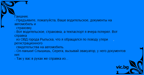 - Вот водительское, страховка, а техпаспорт я вчера потерял. Вот справка