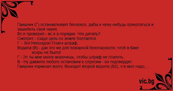 Гаишник (Г) останавливает бензовоз, дабы к чему-нибудь пpикопаться и