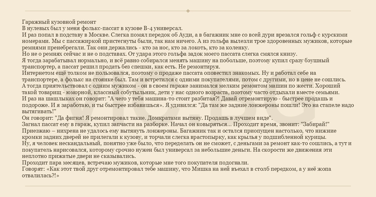 Гаражный кузовной ремонт В нулевых был у меня фолькс-пассат в кузове B-4 универсал. И раз попал в подставу в Москве. Слегка помял передок об Ауди, а в багажник мне со всей дури врезался гольф с курскими номерами. Мы с пассажиркой пристегнуты были, так нам ничего. А из гольфа вылезли трое здоровенных мужиков, которые ремнями пренебрегали. Так они держались - кто за нос, кто за локоть, кто за коленку. Но не о ремнях сейчас и не о подставах. От удара этого гольфа задок моего пассата слегка смялся книзу. Я тогда зарабатывал нормально, и всё равно собирался менять машину на побольше, поэтому купил сразу бэушный транспортер, а пассат решил продать без спешки, как есть. Не ремонтируя. Интернетом ещё толком не пользовался, поэтому о продаже пассата оповестил знакомых. Ну и работал себе на транспортере, а фолькс на стоянке был. Там и встретился с одними покупателями, потом с другими, но в цене не сошлись. А тогда приятельствовал с одним мужиком - он в своем гараже занимался мелким ремонтом машин по жести. Хороший такой товарищ - юморной, классный собутыльник, дети у нас одного возраста, поэтому часто отдыхали вместе семьями. И раз на шашлыках он говорит: "А чего у тебя машина-то стоит разбитая?! Давай отремонтирую - быстрее продашь и подороже. И я заработаю, и ты быстрее избавишься». Я удивился: "Да там же задние лонжероны пошли! Это на стапеле надо вытягивать!" Он говорит: "Да фигня! Я ремонтировал такие. Домкратами вытяну. Продашь в лучшем виде". Загнал пассат ему в гараж, купил запчасти на разборке. Начал он ковыряться… Проходит время, звонит: "Забирай!" Приезжаю – нихрена не удалось ему вытянуть лонжероны. Багажник так и остался приопущен настолько, что нижние кромки задних дверей не прилегали к кузову, и торчали слегка врастопырку, как крылья у подшибленной курицы. Ну, я человек нескандальный, понятно уже было, что переделать он не сможет, с деньгами за ремонт как-то сошлись, а тут и покупатель нарисовался, которому срочно нужен был универсал за небольшие деньги. На скорости же движения эти неплотно прижатые двери не сказывались. Проходит пара месяцев, встречаю мужиков, которые мне того покупателя подогнали. Говорят: «Как этот твой друг отремонтировал тебе машину, что Мишка на ней въехал в столб передком, а у неё жoпa отвалилась?!»