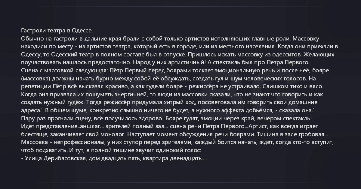 Гастроли театра в Одессе. Обычно на гастроли в дальние края брали с собой только артистов исполняющих главные роли. Массовку находили по месту - из артистов театра, который есть в городе, или из местного населения. Когда они приехали в Одессу, то Одесский театр в полном составе был в отпуске. Пришлось искать массовку из одесситов. Желающих поучаствовать нашлось предостаточно. Народ у них артистичный! А спектакль был про Петра Первого. Сцена с массовкой следующая: Пётр Первый перед боярами толкает эмоциональную речь и после неё, бояре (массовка) должны начать бурно между собой её обсуждать, создать гул и шум человеческих голосов. На репетиции Пётр всё высказал красиво, а как гудели бояре - режиссёра не устраивало. Слишком тихо и вяло. Когда она призвала их пошуметь энергичней, то люди из массовки сказали, что не знают что говорить и как создать нужный гудёж. Тогда режиссёр придумала хитрый ход, посоветовала им говорить свои домашние адреса." В общем шуме, конкретно слышно ничего не будет, а нужного эффекта добьёмся, - сказала она." Пару раз прогнали сцену, всё получилось здорово! Бояре гудят, эмоции через край, вечером спектакль! Идёт представление..аншлаг... зрителей полный зал... сцена речи Петра Первого...Артист, как всегда играет блестяще, заканчивает свой монолог. Наступает момент обсуждения речи боярами. Тишина в зале гробовая... Массовка - непрофессионалы, у них ступор перед зрителями, каждый боится начать, ждёт, когда кто-то вступит, чтоб подхватить. И тут, в полной тишине звучит одинокий голос: - Улица Дерибасовская, дом двадцать пять, квартира двенадцать....