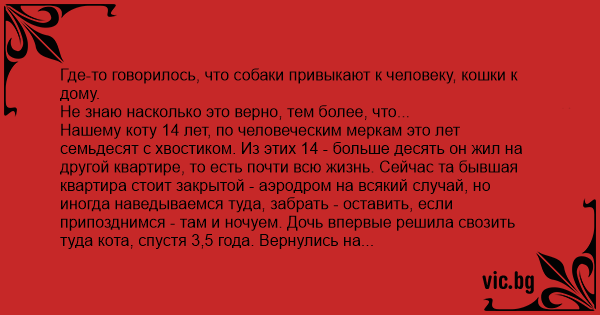 Где-то говорилось, что собаки привыкают к человеку, кошки к дому.