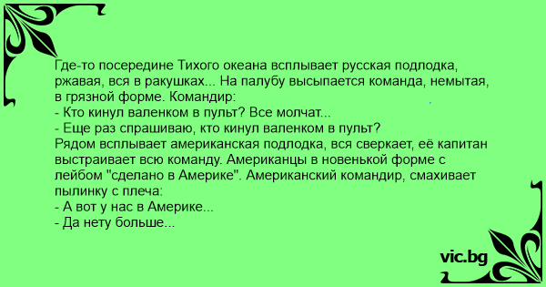 Где-то посередине Тихого океана всплывает русская подлодка, ржавая, вся в ракушках... На палубу высыпается команда, немытая, в грязной форме. Командир: - Кто кинул валенком в пульт? Все молчат... - Еще раз спрашиваю, кто кинул валенком в пульт? Рядом всплывает американская подлодка, вся сверкает, её капитан выстраивает всю команду. Американцы в новенькой форме с лейбом "сделано в Америке". Американский командир, смахивает пылинку с плеча: - А вот у нас в Америке... - Да нету больше вашей Америки. Кто кинул в пульт валенком?