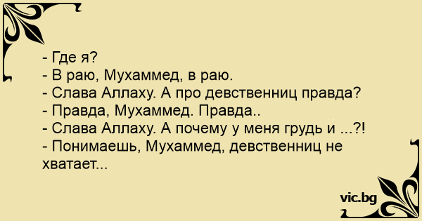 - Понимаешь, Мухаммед, девственниц не хватает...