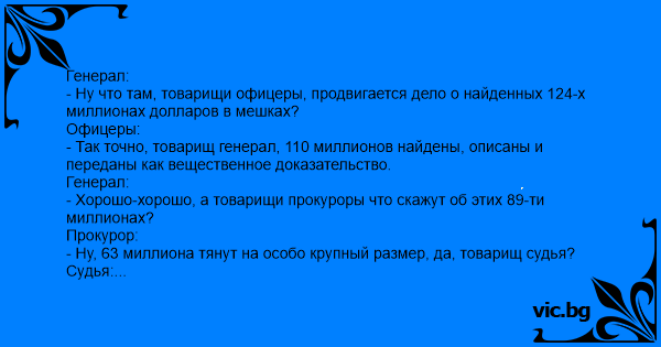 - Ну что там, товарищи офицеры, продвигается дело о найденных 124-х миллионах долларов в мешках?