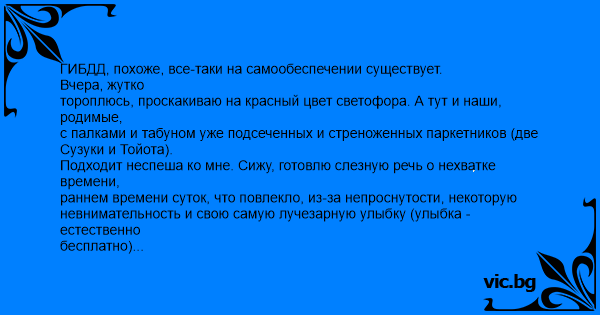 ГИБДД, похоже, все-таки на самообеспечении существует. Вчера, жутко тороплюсь, проскакиваю на красный цвет светофора. А тут и наши, родимые, с палками и табуном уже подсеченных и стреноженных паркетников (две Сузуки и Тойота). Подходит неспеша ко мне. Сижу, готовлю слезную речь о нехватке времени, раннем времени суток, что повлекло, из-за непроснутости, некоторую невнимательность и свою самую лучезарную улыбку (улыбка - естественно бесплатно) Ничего хорошего от общения не жду. - Сержанттакойтооттудато. Вашидокументы пжласта. А глаза - красные - это ничего не сказано, они просто даже не полностью открыты. Как говорится - вчерашняя вечеринка удалась! :) Отдаю документы, а сама в уме считаю, сколько у меня налички в кошельке. - День добрый! А что случилось? (и самый невинный взгляд, который успела отрепетировать) ОТвет не то, что рассмешил, но.... - Вам колеса зимние, на дисках не нужны? ...... А в зеркало заднего вида: напарник очередного паркетника тормозит. Бригадный подряд, что ни говори.