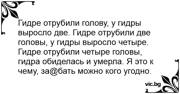 Гидре отрубили голову, у гидры выросло две. Гидре отрубили две головы, у гидры выросло четыре. Гидре отрубили четыре головы, гидра обиделась и умерла. Я это к чему, за@бать можно кого угодно.