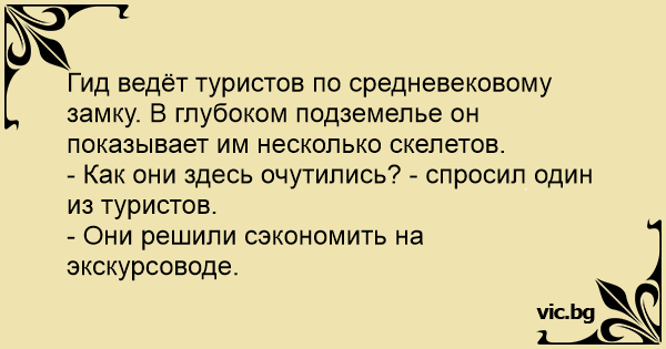 Гид развежда туристи в средновековен замък. В дълбоко подземие той им показва няколко скелета.