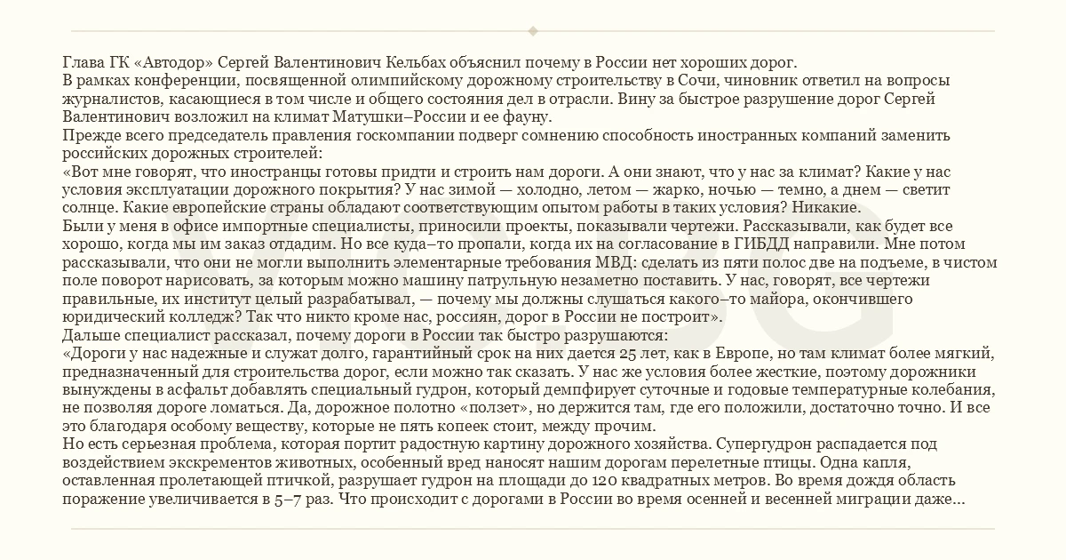 Глава ГК «Автодор» Сергей Валентинович Кельбах объяснил почему в России нет хороших дорог.