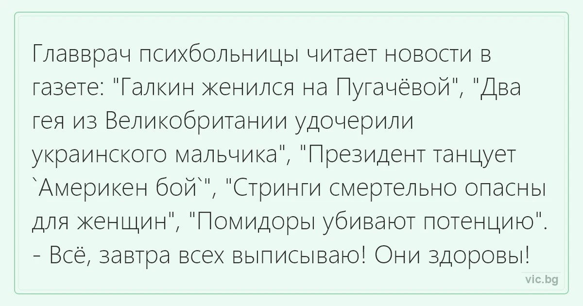 Главврач психбольницы читает новости в газете: "Галкин женился на Пугачёвой", "Два гея из Великобритании удочерили украинского мальчика", "Президент танцует `Америкен бой`", "Стринги смертельно опасны для женщин", "Помидоры убивают потенцию". - Всё, завтра всех выписываю! Они здоровы!