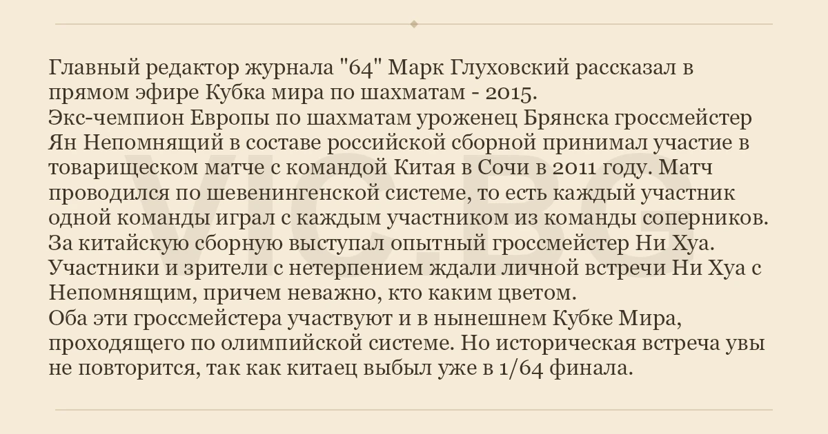 Главный редактор журнала "64" Марк Глуховский рассказал в прямом эфире Кубка мира по шахматам - 2015.