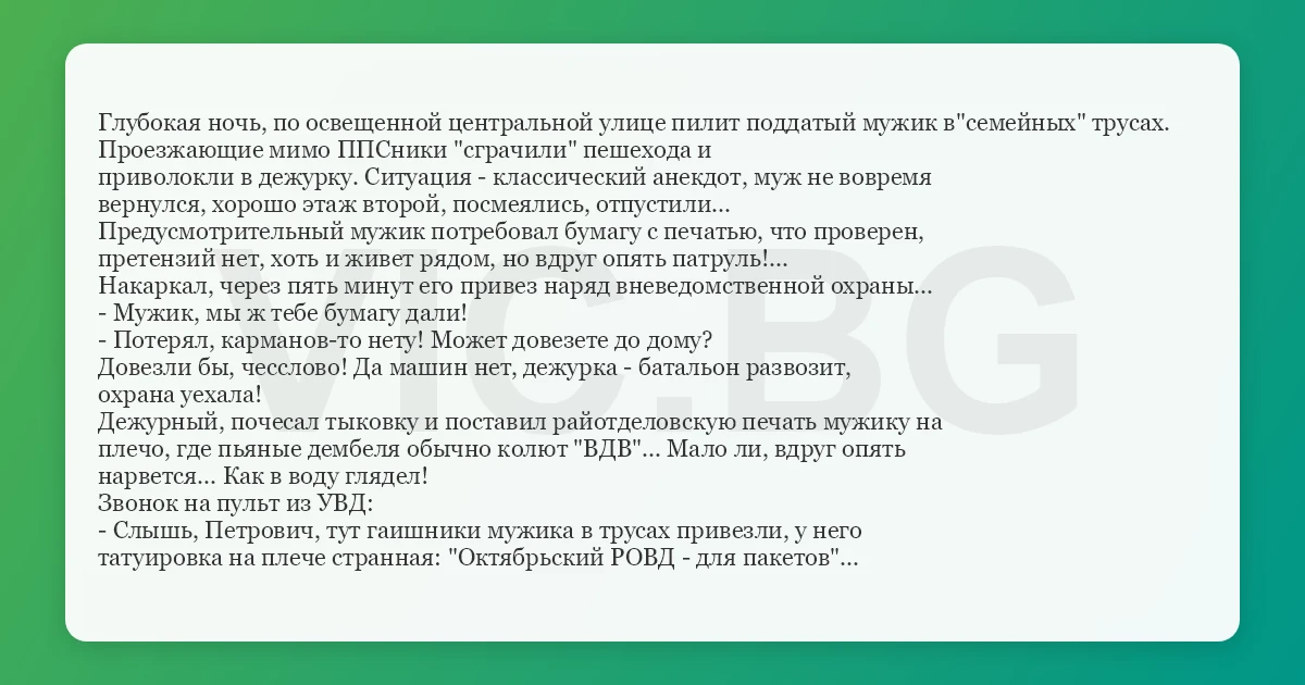 Глубокая ночь, по освещенной центральной улице пилит поддатый мужик в"семейных" трусах. Проезжающие мимо ППСники "сграчили" пешехода и приволокли в дежурку. Ситуация - классический анекдот, муж не вовремя вернулся, хорошо этаж второй, посмеялись, отпустили... Предусмотрительный мужик потребовал бумагу с печатью, что проверен, претензий нет, хоть и живет рядом, но вдруг опять патруль!... Накаркал, через пять минут его привез наряд вневедомственной охраны... - Мужик, мы ж тебе бумагу дали! - Потерял, карманов-то нету! Может довезете до дому? Довезли бы, чесслово! Да машин нет, дежурка - батальон развозит, охрана уехала! Дежурный, почесал тыковку и поставил райотделовскую печать мужику на плечо, где пьяные дембеля обычно колют "ВДВ"... Мало ли, вдруг опять нарвется... Как в воду глядел! Звонок на пульт из УВД: - Слышь, Петрович, тут гаишники мужика в трусах привезли, у него татуировка на плече странная: "Октябрьский РОВД - для пакетов"...