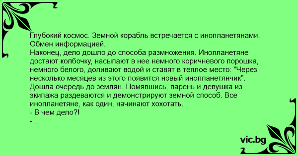Наконец, дело дошло до способа размножения. Инопланетяне достают колбочку, насыпают в нее немного коричневого порошка, немного белого, доливают водой и ставят в теплое место: "Через несколько месяцев из этого появится новый инопланетянчик".
