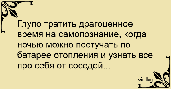 Глупо тратить драгоценное время на самопознание, когда ночью можно постучать по батарее отопления и узнать все про себя от соседей...