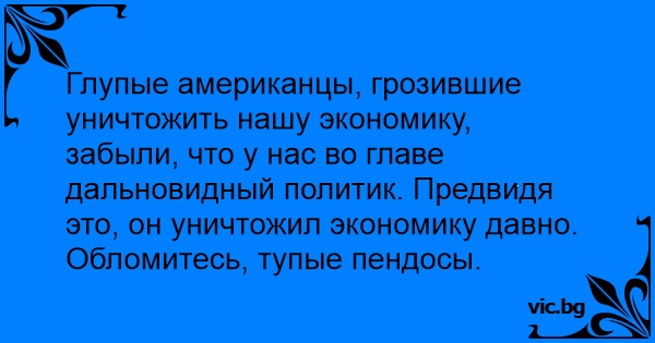 Глупые американцы, грозившие уничтожить нашу экономику, забыли, что у нас во главе дальновидный политик. Предвидя это, он уничтожил экономику давно. Обломитесь, тупые пендосы.
