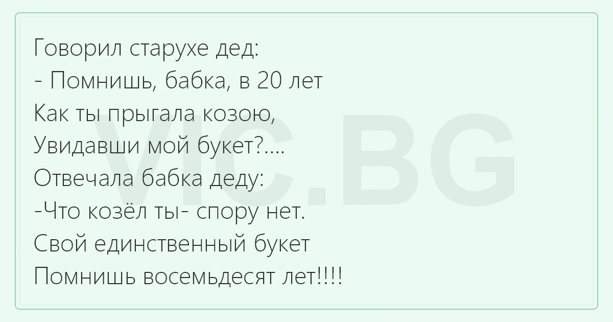 Говорил старухе дед: - Помнишь, бабка, в 20 лет Как ты прыгала козою, Увидавши мой букет?.... Отвечала бабка деду: -Что козёл ты- спору нет. Свой единственный букет Помнишь восемьдесят лет!!!!