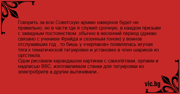 Говорить за всю Советскую армию наверное будет не правильно, но в части где я служил срочную, в каждом призыве с завидным постоянством ,обычно в весенний период (думаю связано с учением Фрейда и сезонным гоном) у воинов отслуживших год , то бишь у «черпаков» появлялась жгучая тяга к тематической татуировке и установке в члeн шариков из оргстекла.