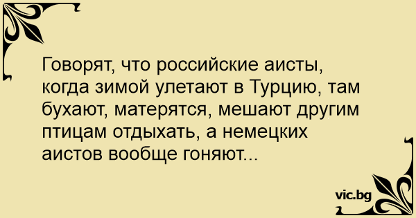 Говорят, что российские аисты, когда зимой улетают в Турцию, там бухают, матерятся, мешают другим птицам отдыхать, а немецких аистов вообще гоняют...