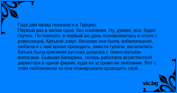 Первый раз в жизни одна, без компании. Ну, думаю, все, будет скучно. Но повезло, в первый же день познакомилась в отеле с ровесницей, Катькой зовут. Веселая она была, взбалмошная, любила я с ней время проводить, вместе гуляли, веселились. Катька была красивая русская девушка с темно-русыми волосами. Бывшая балерина, теперь работала ассистенткой директора в одной фирме, куда ее устроил ее любовник. Вот с этим любовником-то она планировала проводить свой отдых, но любовник почему-то опаздывал и Катька заметно нервничала из-за этого. А в остальном… лето, море, солнце, теплые вечера, непривычные блюда, море красивых шмоток, короче, мы с ней не скучали.