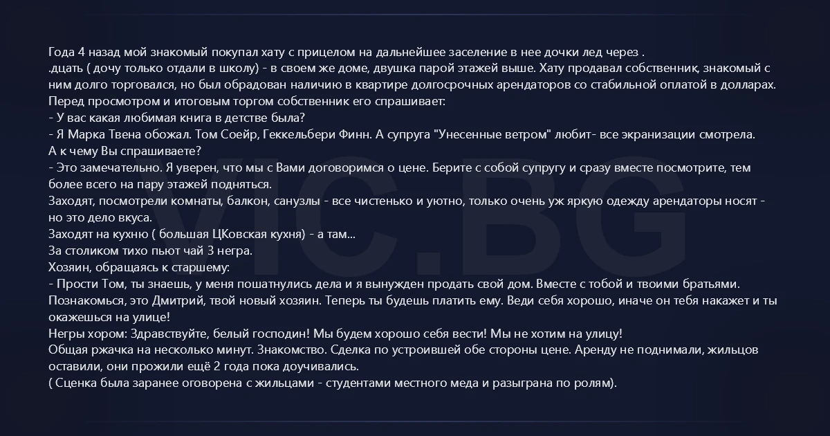 Года 4 назад мой знакомый покупал хату с прицелом на дальнейшее заселение в нее дочки лед через . .дцать ( дочу только отдали в школу) - в своем же доме, двушка парой этажей выше. Хату продавал собственник, знакомый с ним долго торговался, но был обрадован наличию в квартире долгосрочных арендаторов со стабильной оплатой в долларах. Перед просмотром и итоговым торгом собственник его спрашивает: - У вас какая любимая книга в детстве была? - Я Марка Твена обожал. Том Соейр, Геккельбери Финн. А супруга "Унесенные ветром" любит- все экранизации смотрела. А к чему Вы спрашиваете? - Это замечательно. Я уверен, что мы с Вами договоримся о цене. Берите с собой супругу и сразу вместе посмотрите, тем более всего на пару этажей подняться. Заходят, посмотрели комнаты, балкон, санузлы - все чистенько и уютно, только очень уж яркую одежду арендаторы носят - но это дело вкуса. Заходят на кухню ( большая ЦКовская кухня) - а там... За столиком тихо пьют чай 3 негра. Хозяин, обращаясь к старшему: - Прости Том, ты знаешь, у меня пошатнулись дела и я вынужден продать свой дом. Вместе с тобой и твоими братьями. Познакомься, это Дмитрий, твой новый хозяин. Теперь ты будешь платить ему. Веди себя хорошо, иначе он тебя накажет и ты окажешься на улице! Негры хором: Здравствуйте, белый господин! Мы будем хорошо себя вести! Мы не хотим на улицу! Общая ржачка на несколько минут. Знакомство. Сделка по устроившей обе стороны цене. Аренду не поднимали, жильцов оставили, они прожили ещё 2 года пока доучивались. ( Сценка была заранее оговорена с жильцами - студентами местного меда и разыграна по ролям).