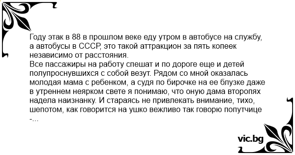 Все пассажиры на работу спешат и по дороге еще и детей полупроснувшихся с собой везут. Рядом со мной оказалась молодая мама с ребенком, а судя по бирочке на ее блузке даже в утреннем неярком свете я понимаю, что оную дама второпях надела наизнанку. И стараясь не привлекать внимание, тихо, шепотом, как говорится на ушко вежливо так говорю попутчице - мол так и так, такой вот казус, обратите мол внимание и исправьте. И все, вот я герой, сделал доброе дело, предупредил, можно сказать спас от распространения позора. Ан нет. В ответ услышал благодарное - Ну ты б...