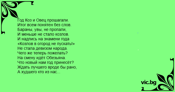 Год Коз и Овец прошагали. Итог всем понятен без слов. Бараны, увы, не пропали, И меньше не стало козлов. И надпись на знамени года «Козлов в огород не пускать!» Не стала девизом народа. Чего же теперь пожелать? На смену идёт Обезьяна. Что новый нам год принесёт? Ждать лучшего вроде бы рано, А худшего кто из нас ждёт? Ещё високосность приспела – Не слишком приветливый знак. Но нет у надежды предела, И новый нам надобен флаг. На нём – обезьяна с гранатой (Поскольку воюем с ИГИЛ) И лозунг (хотелось бы матом, Но цензор, увы, запретил). Поэтому пишем цензурно, Стараясь слова подобрать: «Плевать. Не дождётесь!». И бурно Закончим девиз: «Вашу мать!» И с этим придуманным флагом Навстречу январским ветрам Войдём в новый год твёрдым шагом. Деваться-то некуда нам…