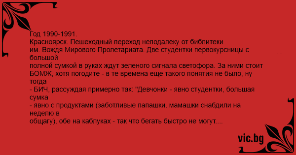 Год 1990-1991. Красноярск. Пешеходный переход неподалеку от библитеки им. Вождя Мирового Пролетариата. Две студентки первокурсницы с большой полной сумкой в руках ждут зеленого сигнала светофора. За ними стоит БОМЖ, хотя погодите - в те времена еще такого понятия не было, ну тогда - БИЧ, рассуждая примерно так: "Девчонки - явно студентки, большая сумка - явно с продуктами (заботливые папашки, мамашки снабдили на неделю в общагу), обе на каблуках - так что бегать быстро не могут. Выхватывает сумку и на желтый сигнал мчится через дорогу. ХА, да не тут- то было, одна из девиц и правда впала в ступор, но другая резвой рысью пустилась в погоню, и не одна - ей на помощь пришел молодой мужчина стоящий на том же переходе. Короче, вдвоем они быстро поймали и обезвредили того бедолагу, парень этот оказался лейтенантом милиции, который очень хотел стать старшим лейтенантом,(этот переход как-раз у крыльца КрайУВД), добро вернулось к владелицам, которые почему-то покатывались со смеху. Оказалось девицы путь держали из той самой библиотеки, а в сумке лежал УГОЛОВНО-ПРОЦЕССУАЛЬНЫЙ КОДЕКС СССР, и прочая справочная литература по уголовному праву. То-то порадовался бы БИЧ заглянув в сумку.
