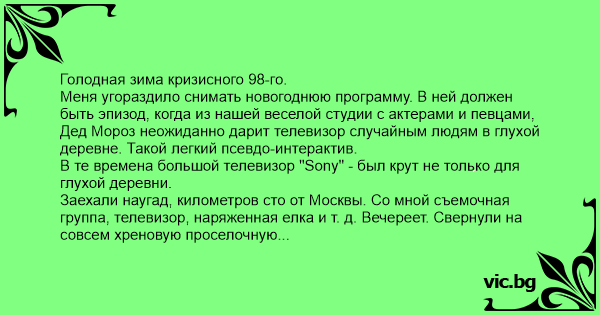 Меня угораздило снимать новогоднюю программу. В ней должен быть эпизод, когда из нашей веселой студии с актерами и певцами, Дед Мороз неожиданно дарит телевизор случайным людям в глухой деревне. Такой легкий псевдо-интерактив.
