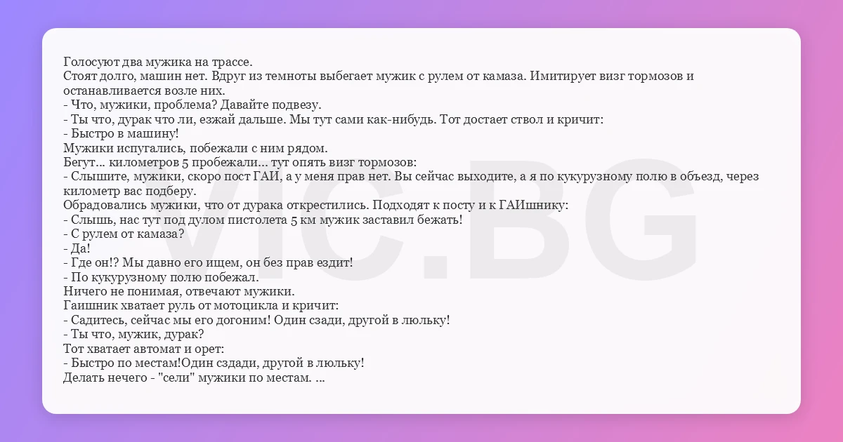 Голосуют два мужика на трассе. Стоят долго, машин нет. Вдруг из темноты выбегает мужик с рулем от камаза. Имитирует визг тормозов и останавливается возле них. - Что, мужики, проблема? Давайте подвезу. - Ты что, дуpak что ли, езжай дальше. Мы тут сами как-нибудь. Тот достает ствол и кричит: - Быстро в машину! Мужики испугались, побежали с ним рядом. Бегут... километров 5 пробежали... тут опять визг тормозов: - Слышите, мужики, скоро пост ГАИ, а у меня прав нет. Вы сейчас выходите, а я по кукурузному полю в объезд, через километр вас подберу. Обрадовались мужики, что от дурака открестились. Подходят к посту и к ГАИшнику: - Слышь, нас тут под дулом пистолета 5 км мужик заставил бежать! - С рулем от камаза? - Да! - Где он!? Мы давно его ищем, он без прав ездит! - По кукурузному полю побежал. Ничего не понимая, отвечают мужики. Гаишник хватает руль от мотоцикла и кричит: - Садитесь, сейчас мы его догоним! Один сзади, другой в люльку! - Ты что, мужик, дуpak? Тот хватает автомат и орет: - Быстро по местам!Один сздади, другой в люльку! Делать нечего - "сели" мужики по местам. Бегут втроем по кукурузному полю. Гаишник орет на одного: - Ты что делаешь!? Ты же в люльке! Почему на прямых ногах? Быстро присаживайся! Мужик бежит на полусогнутых ногах, початки ему по лицу ударяют, ничего не видит, ноги болят, оборачивается к другу на заднем сиденье и говорит: - На фигa пересаживались, ехали бы себе спокойно на камазе!