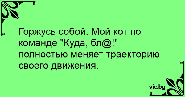 Горжусь собой. Мой кот по команде "Куда, бл@!" полностью меняет траекторию своего движения.<br />