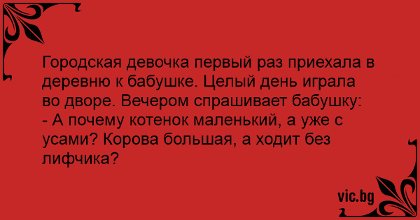 Городская девочка первый раз приехала в деревню к бабушке. Целый день играла во дворе. Вечером спрашивает бабушку: