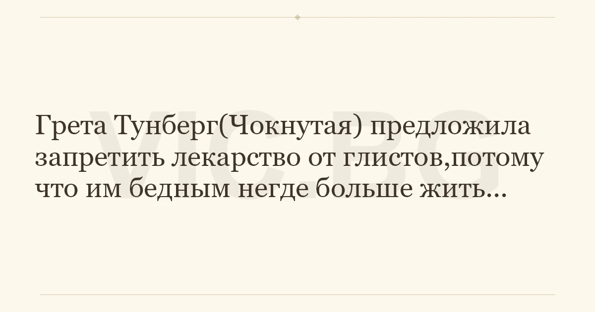 Грета Тунберг(Чокнутая) предложила запретить лекарство от глистов,потому что им бедным негде больше жить...