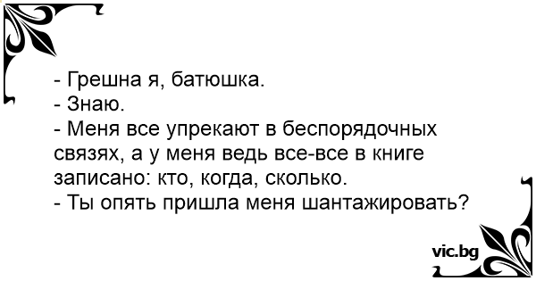 - Меня все упрекают в беспорядочных связях, а у меня ведь всe-всe в книге записано: кто, когда, сколько.