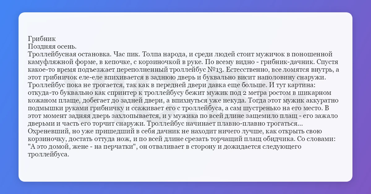 Троллейбус пока не трогается, так как в передней двери давка еще больше. И тут картина: откуда-то буквально как спринтер к троллейбусу бежит мужик под 2 метра ростом в шикарном кожаном плаще, добегает до задней двери, а впихнуться уже некуда. Тогда этот мужик аккуратно подмышки руками грибничку и ссаживает его с троллейбуса, а сам шустренько на его место. В этот момент задняя дверь захлопывается, и у мужика по всей длине защемило плащ - его зажало дверьми и часть его торчит снаружи. Троллейбус начинает плавно-плавно трогаться...