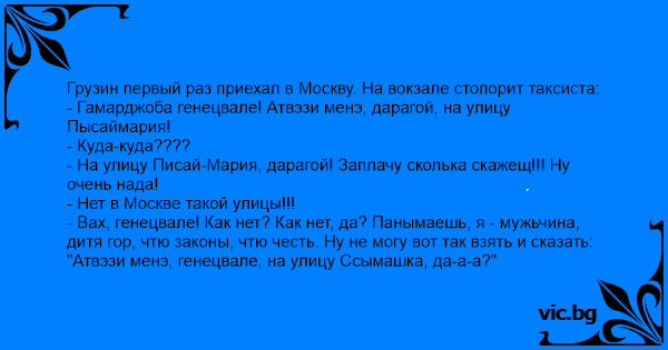 - Гамарджоба генецвале! Атвэзи менэ, дарагой, на улицу Пысаймария!