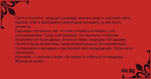 Группа геологов, ведущих разведку земных недр в якутской тайге, наняла себе в проводники немолодую женщину из местного племени. Однажды случилось так, что они остались ночевать у ее соплеменников. Тогда они увидели, что мужчины племени позволяют их проводнице питаться лишь скудными объедками. Геологи были потрясены таким возмутительно бесчеловечным отношением к женщине и высказали свое возмущение. Тогда им и объяснили… Мужчина — охотник и воин. Он может и отбиться от хищника. Женщина может только убежать или забраться на дерево. Они о ней так заботились. Если женщина будет толстая, то не сможет быстро двигаться, и любой зверь в тайге ее легко поймает. А женщина чаще всего не способна самостоятельно соблюдать жесткую диету. Они так продлевали ее жизнь.