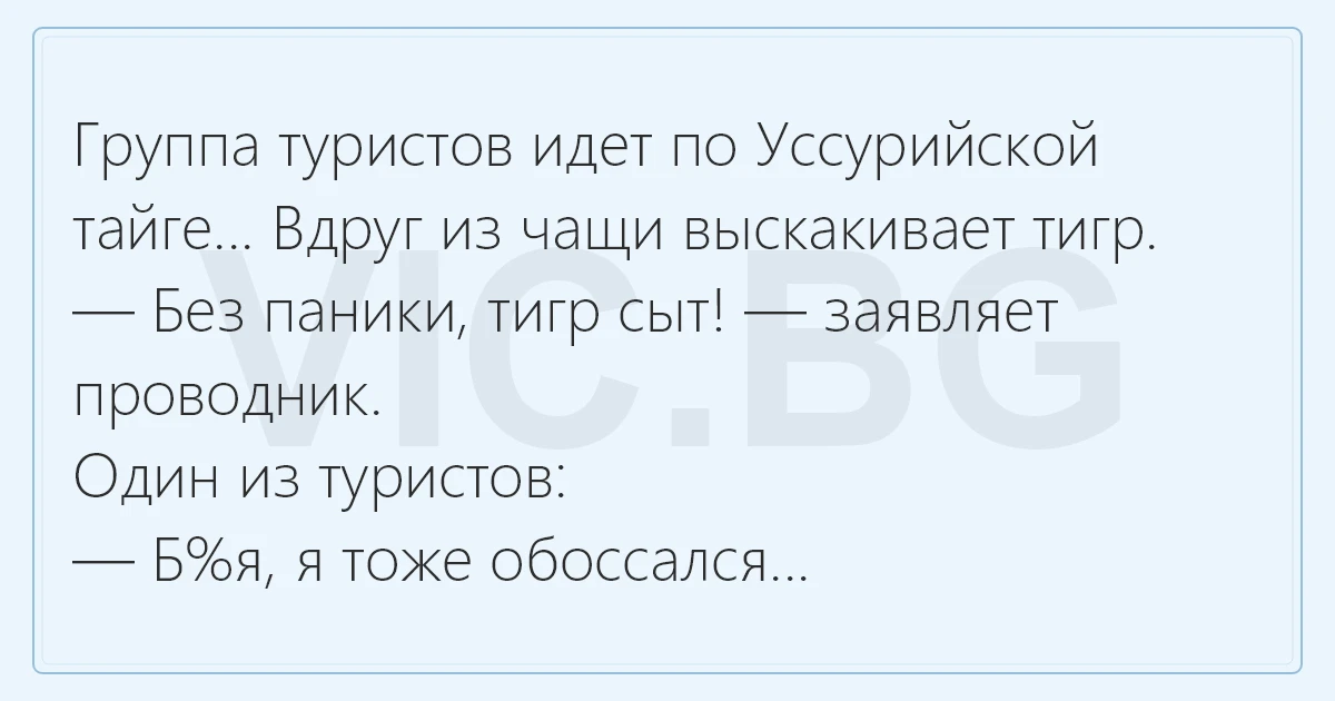 Группа туристов идет по Уссурийской тайге... Вдруг из чащи выскакивает тигр.