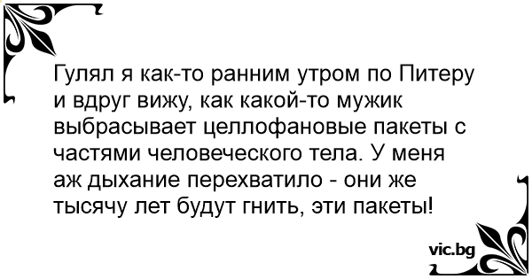 Гулял я как-то ранним утром по Питеру и вдруг вижу, как какой-то мужик выбрасывает целлофановые пакеты с частями человеческого тела. У меня аж дыхание перехватило - они же тысячу лет будут гнить, эти пакеты!